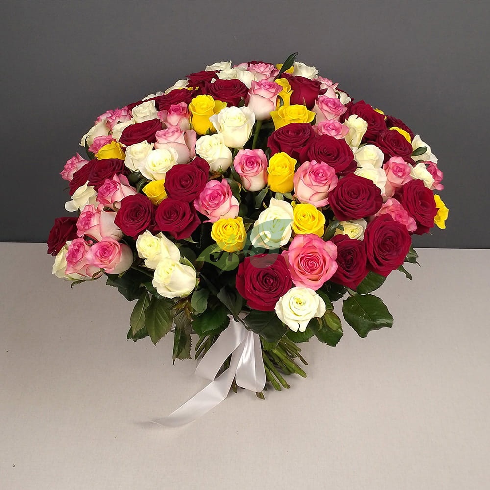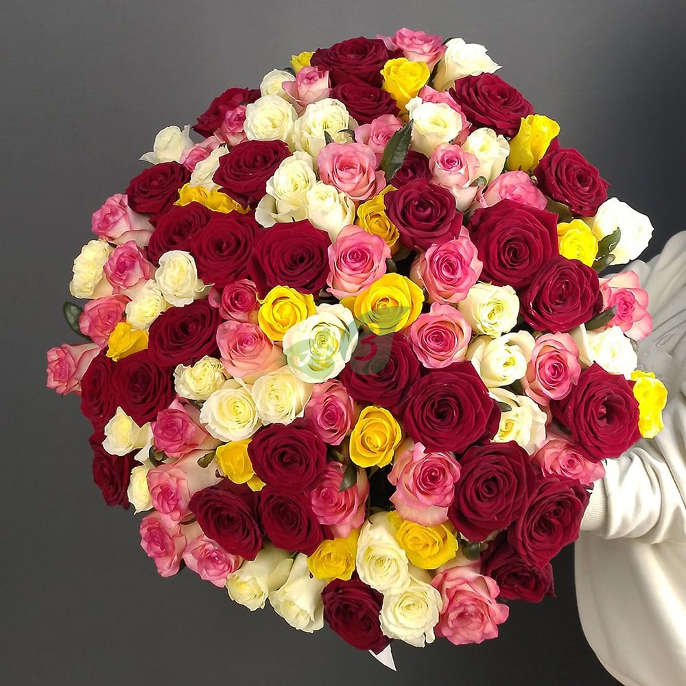 Свежие красные, розовые и желтые розы в единой композиции из 101 штуки будут радовать получателя не один день. А их аромат напомнит о весне.